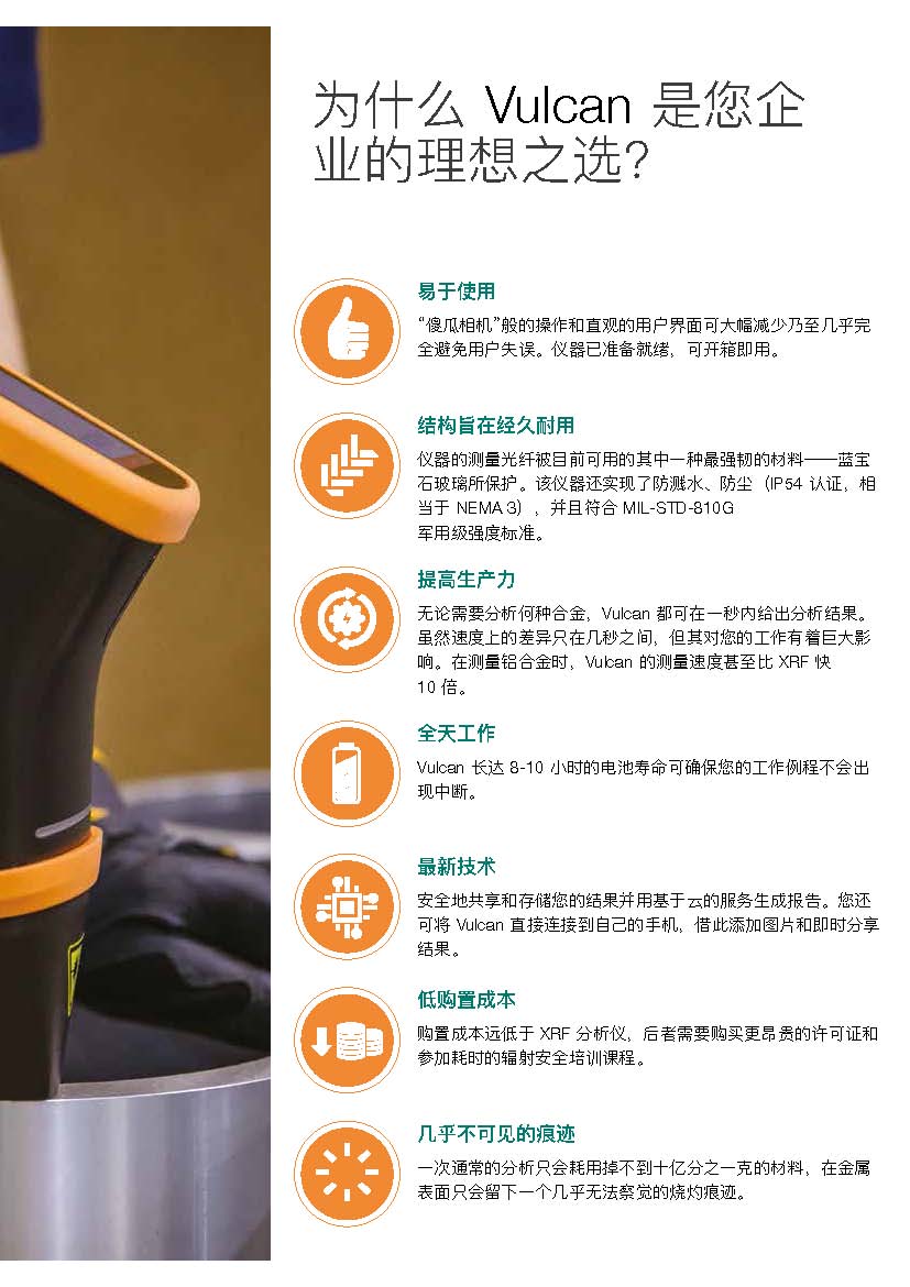 Vulcan 是一款耐用且分析速度極快的合金分析儀??郯鈾C后一秒即會顯示結果。且產品使用激光誘導擊穿光譜技術 (LIBS),您無需擔心X射線的影響。無論您的業務是廢料分選還是 PMI 質量控制,Vulcan 始終提供準確且一致的合金 牌號。