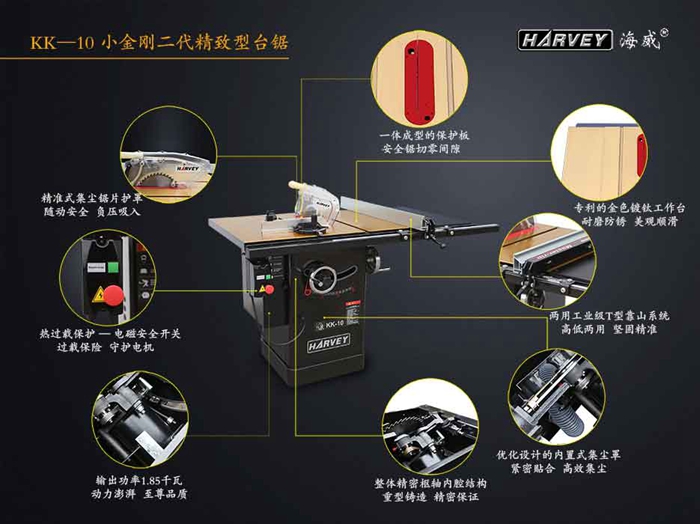 小金剛2代臺(tái)鋸KK10-II是海威多年來(lái)技術(shù)和工藝研究的結(jié)晶,其**的工藝、精度、**性和操作舒適性都處于世界同類產(chǎn)品的上等水平。本系列臺(tái)鋸適用于各種精密實(shí)木加工,廣泛應(yīng)用與制作上等家具、櫥柜、樂(lè)器和工藝品等木器,也是廣大木工愛(ài)好者的必備利器,被木工界稱為“木工房King”,在過(guò)去的五年中,已有超過(guò)25000臺(tái)HW110系列臺(tái)鋸銷往世界30多個(gè)國(guó)家。