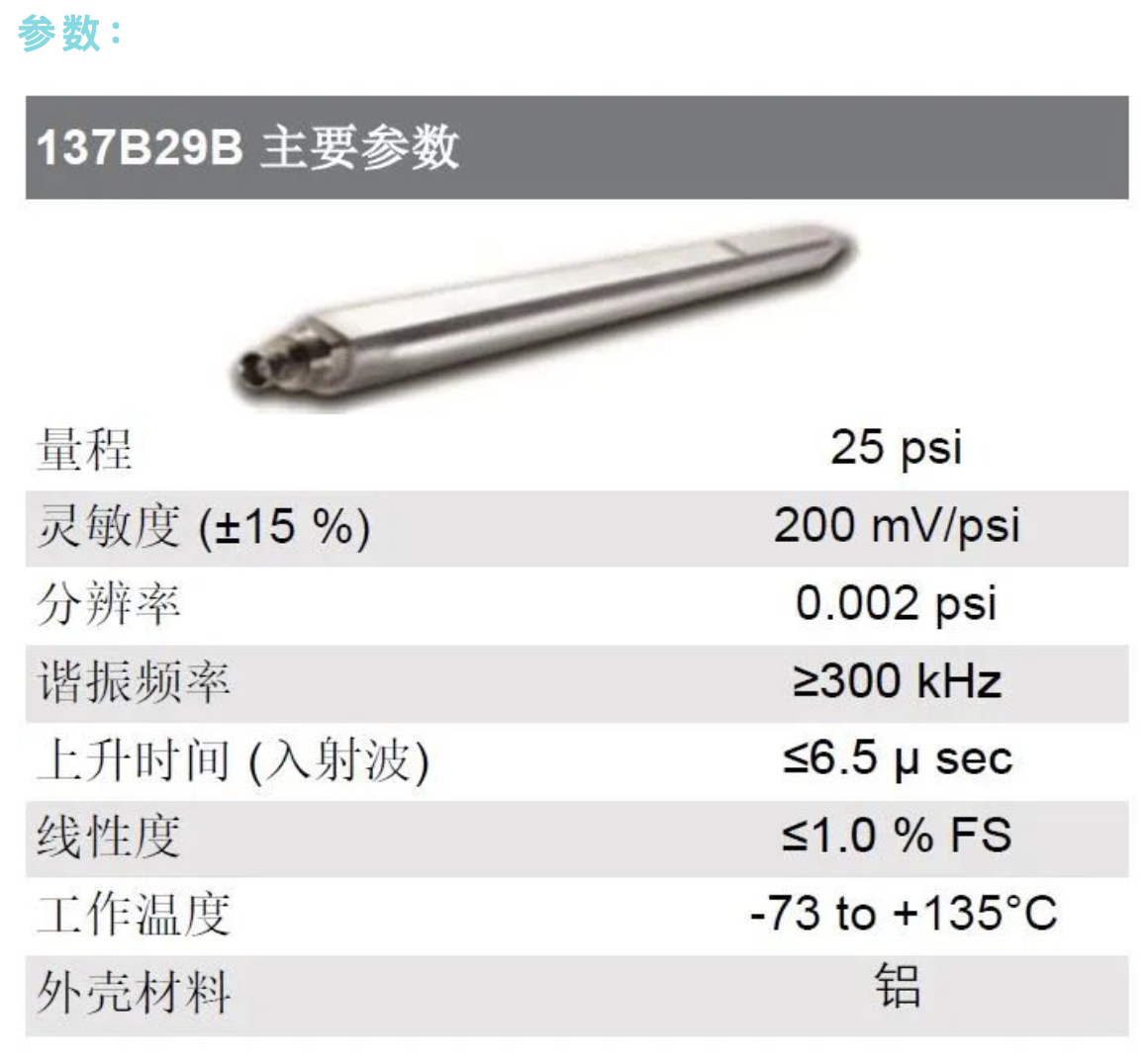 137B29B是一款高靈敏度、ICP?鉛筆式爆炸壓力傳感器,設計用于空中爆炸產生的爆炸壓力和沖擊波測量。空中爆炸常見于在航空航天、國防、采礦及/或爆炸研究等領域。137B29B除能夠提供到達時間、峰值壓力和總脈沖等測量之外,由于其為雙通道型號,還能額外確定沖擊波的速度和到達時間(TOA)。137B29B 采用鋁制外殼,電氣接頭為雙通道4針接頭。