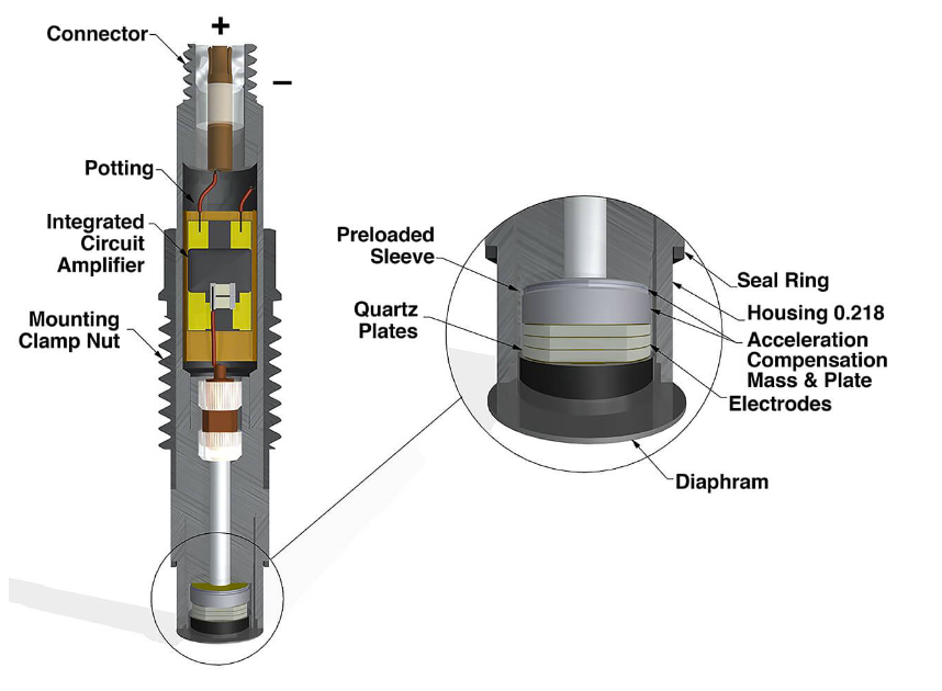 大多數(shù)PCB?壓電型壓力傳感器中的石英晶體在堅(jiān)固的傳感器外殼內(nèi)采用壓縮式預(yù)緊,電氣石晶體采用無約束形式。這些設(shè)計(jì)使傳感器具有微秒級響應(yīng)時間和幾百赫茲的固有頻率,能夠*小化過沖或者振鈴現(xiàn)象發(fā)生的可能性。